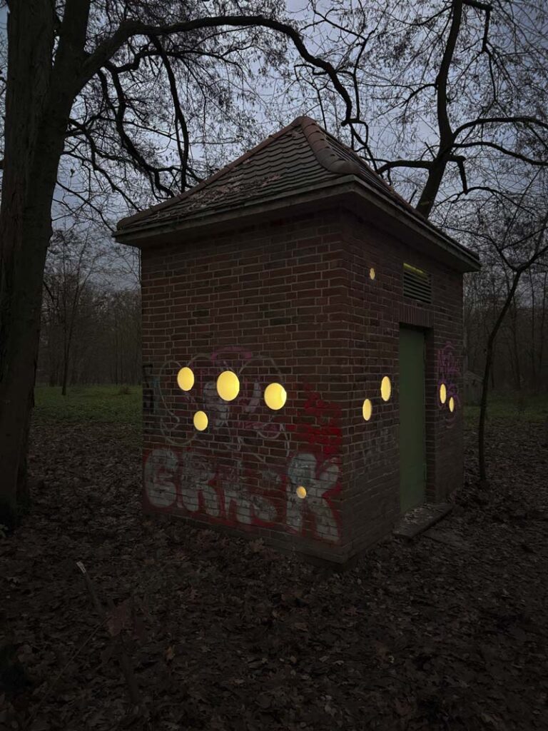 Schon eine kleine Leuchte im Inneren bringt die Gucklöcher zum Strahlen. Das Mini-Museum Trafohaus wird…