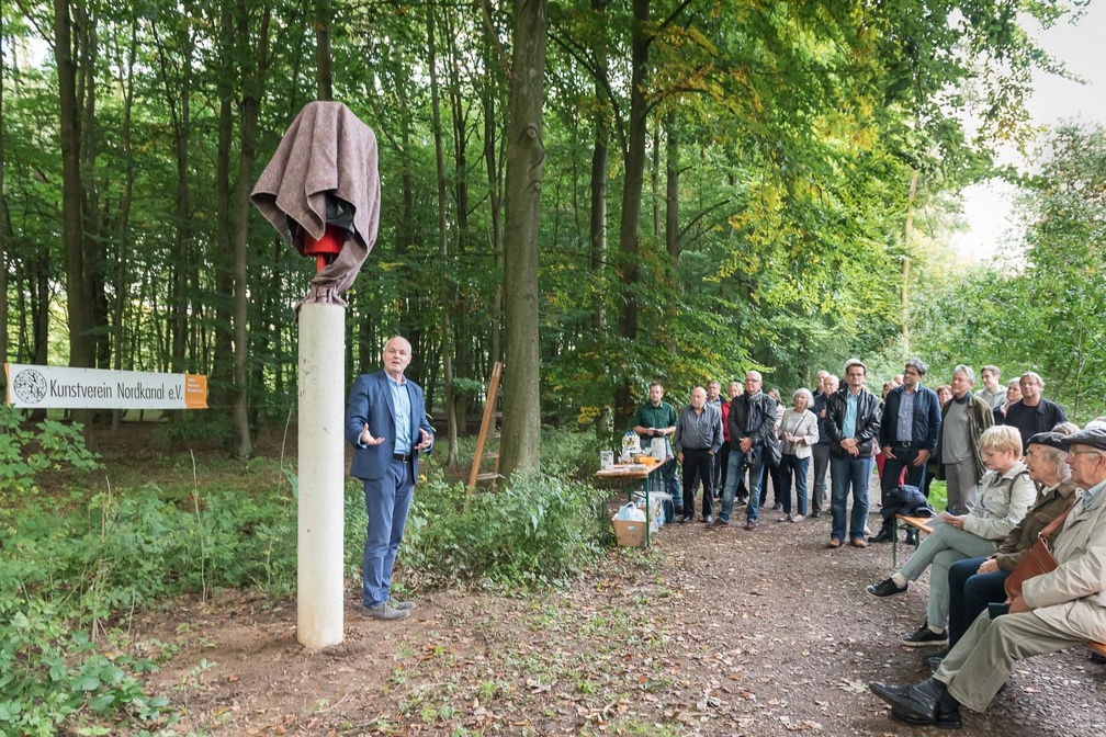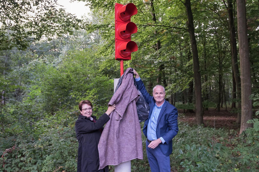 Eine signalrote ehemalige Verkehrsampel steht jetzt auf der zwei Meter hohen Betonsäule. Damit ist der erste Ableger des Kaarster Stelenkunstkonzepts im Vorster Wald angekommen.