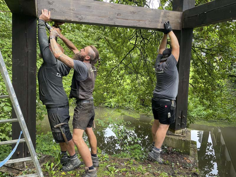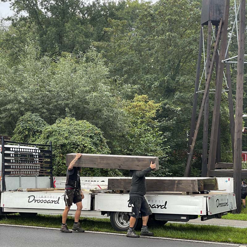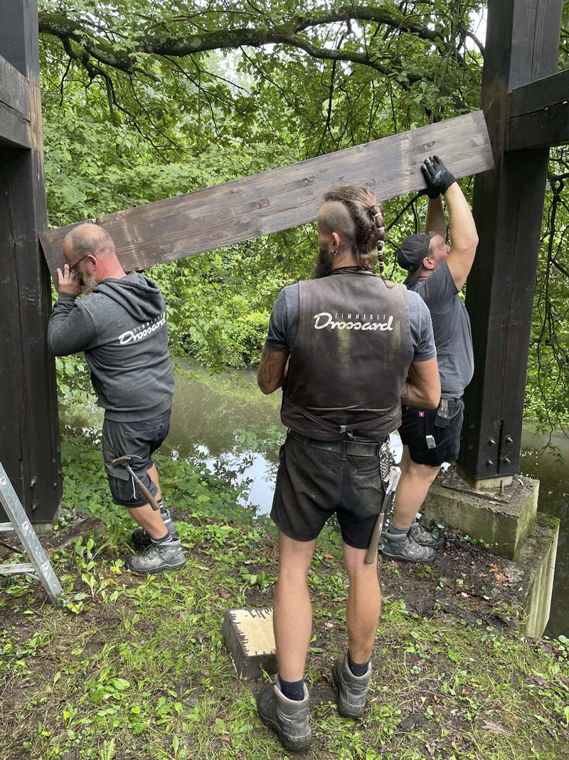 In einem ersten Schritt im Juli wurden die Brücken komplett abgeschliffen und gestrichen. Jetzt wurden innerhalb von drei Tagen die maroden Querbalken der Türme ausgetauscht. Somit sind die Sanierungsarbeiten an den Brücken abgeschlossen. Auch für diese Arbeiten waren die Mitarbeiter der Zimmerei Drossard zuverlässige und absolut gewissenhafte Partner. Dafür vielen Dank!