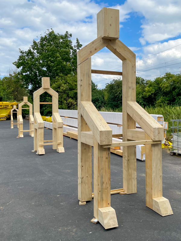 Vor ein paar Tagen konnten wir zum ersten Mal die neuen, fast fertigen „Türhüter“ bewundern. Die Zimmerei Drossard hat mit ihren Zimmermännern ganze Arbeit geleistet. Imposant stehen die vier Holzfiguren auf dem Werkhof. Bildhauer Wilhelm Schiefer hat die einzelnen Skulpturen im richtigen Abstand zueinander platziert. Genauso wird das Figurenensemble auch im Vorster Wald aufgestellt werden.