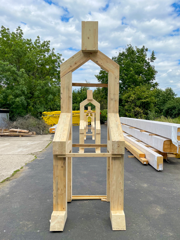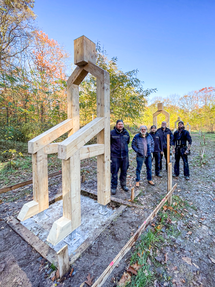Vor ein paar Tagen konnten wir zum ersten Mal die neuen, fast fertigen „Türhüter“ bewundern. Die Zimmerei Drossard hat mit ihren Zimmermännern ganze Arbeit geleistet. Imposant stehen die vier Holzfiguren auf dem Werkhof. Bildhauer Wilhelm Schiefer hat die einzelnen Skulpturen im richtigen Abstand zueinander platziert. Genauso wird das Figurenensemble auch im Vorster Wald aufgestellt werden.