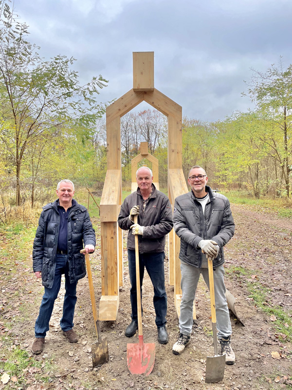 Der perfekte Einstieg zur Begrüßungsrede des Vorsitzenden Markus Albiez. Er machte deutlich wie viele engagierte Personen an der Umsetzung eines solchen Kunstprojekts beteiligt waren. Vom Künstler Wilhelm Schiefer kam der Anstoß, der dann vom Vorstand des Kunstvereins (Klaus-Dieter Pruss, Markus-Maria Hoffmann und Dieter Schädiger) für die Umsetzung konkretisiert wurde. Anschließend kamen Kulturamt (Dieter Güsgen und Dorothee Kraus), der Kulturausschuss und das Umweltamt mit ins Boot. Für die praktische Ausführung zeigten sich der „Brücken“-Architekt Wilfried Rochholl, die Zimmerei Drossard und der Bauunternehmer Stoffels verantwortlich.