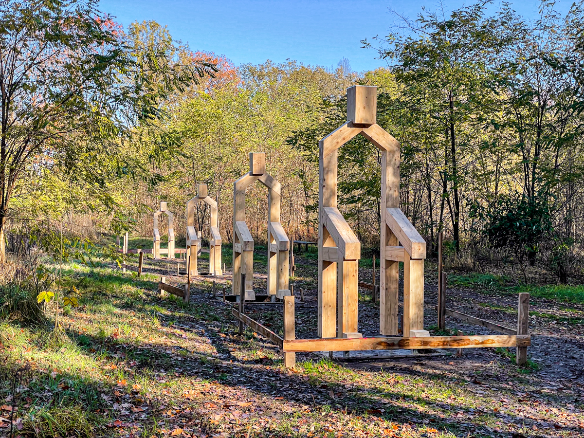 Zwei Trimm-dich-Geräte in der Blickachse der „Türhüter“. Ein weiteres Fitnessgerät direkt neben der „Waldhütte“, keine vier Meter davon entfernt. Gibt es keinen anderen Standort für Sportgeräte als in direkter visueller Nachbarschaft der angestammten Kunstwerke? Ja, der Vorster Wald ist nicht groß, aber groß genug, um einen separaten Platz für die Sportgeräte zu finden.