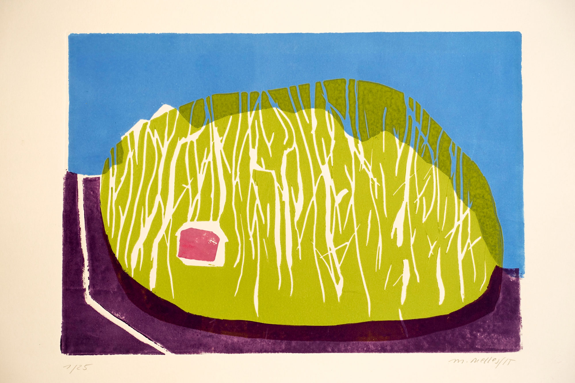 Die auf 170g-Papier gedruckte Grafik erhalten Sie mit Passepartout. Der Linoldruck hat das Format 40 x 30 cm und ist für Standardrahmen geeignet.