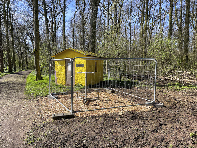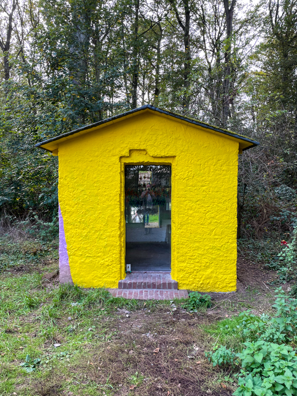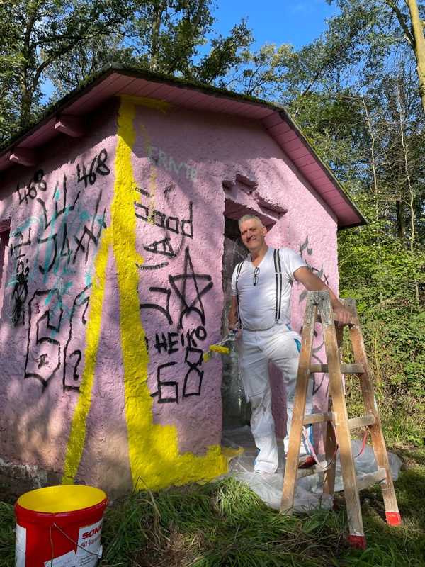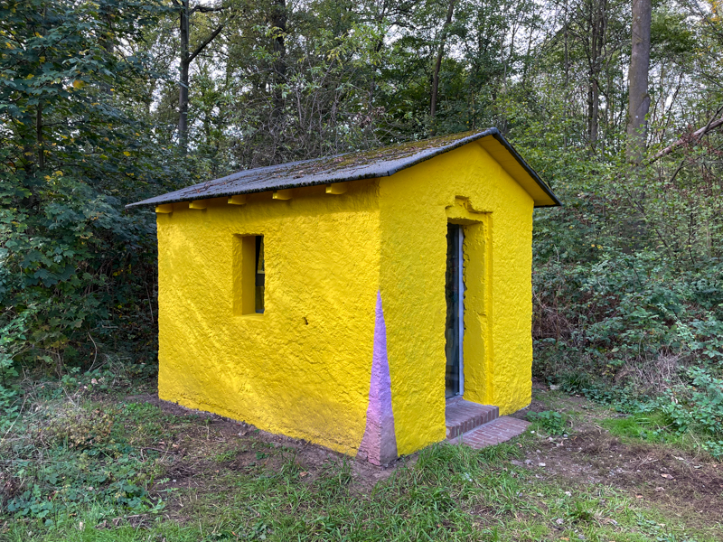 Leider wurde die „Waldhütte“ in der letzten Zeit noch einmal massiv durch Graffitis verschandelt und die Glastür durch rohe Gewalt endgültig zerstört. Deswegen haben wir in Abstimmung mit der Künstlerin Monika Nelles die „Waldhütte“ saniert. Wie ein Chamäleon wechselt die „Waldhütte“ nun die Farbe. Ursprünglich rosa ist sie jetzt gelb. An einer Ecke kann man noch die Vorgängerfarbe erkennen, sodass der Verwandlungsprozess sichtbar bleibt. Auch die Glastür ist nun ersetzt. Wir hoffen, dass die kostspielige Sanierung respektiert wird. Wir werden uns weiterhin um die „Waldhütte“ kümmern und sie beschützen, so gut es geht.
