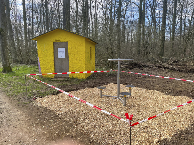 Zwei Trimm-dich-Geräte in der Blickachse der „Türhüter“. Ein weiteres Fitnessgerät direkt neben der „Waldhütte“, keine vier Meter davon entfernt. Gibt es keinen anderen Standort für Sportgeräte als in direkter visueller Nachbarschaft der angestammten Kunstwerke? Ja, der Vorster Wald ist nicht groß, aber groß genug, um einen separaten Platz für die Sportgeräte zu finden.