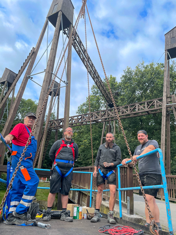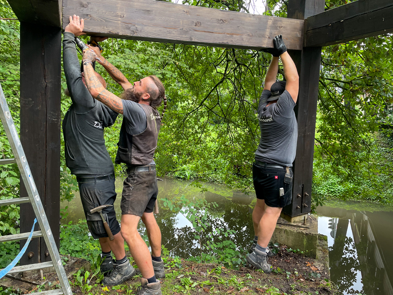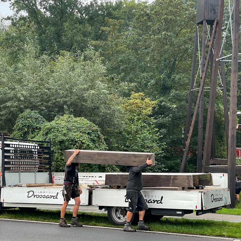 Nach 14 Jahren ist es nötig, die Holzkonstruktion gründlich zu sanieren. Zimmermänner werden Holzbalken austauschen, das Holz abschleifen und mit Holzschutzmittel streichen. Dafür muss für drei Tage ein mobiler Schwerlastkran mit Personenkorb aufgebaut werden, damit die Arbeiten überhaupt ausgeführt werden können.