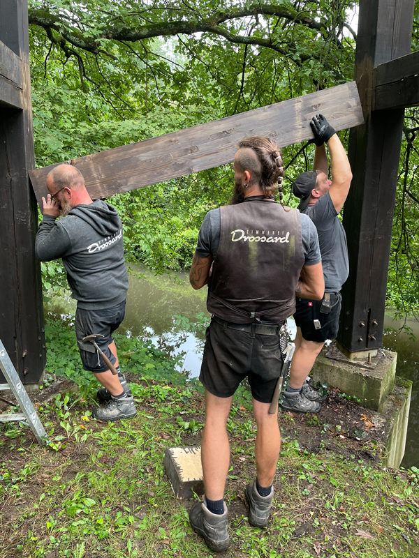 In einem ersten Schritt im Juli wurden die „Brücken“ komplett abgeschliffen und gestrichen. Jetzt wurden innerhalb von drei Tagen die maroden Querbalken der Türme ausgetauscht. Somit sind die Sanierungsarbeiten an den „Brücken“ abgeschlossen. Auch für diese Arbeiten waren die Mitarbeiter der Zimmerei Drossard zuverlässige und absolut gewissenhafte Partner. Dafür vielen Dank!