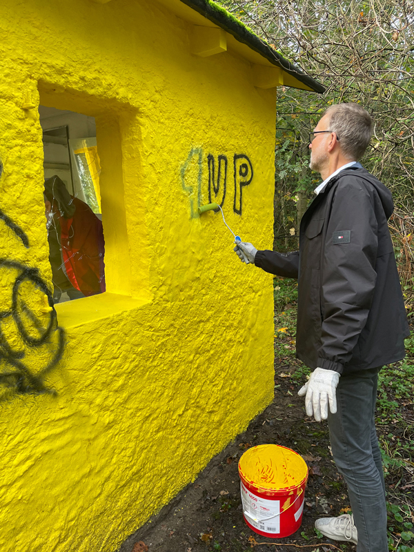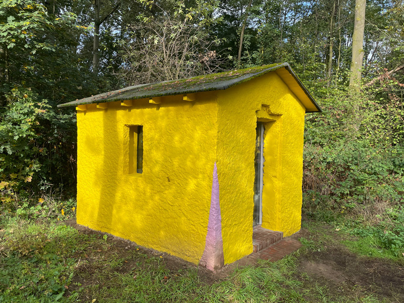 Leider wurde die „Waldhütte“ in der letzten Zeit noch einmal massiv durch Graffitis verschandelt und die Glastür durch rohe Gewalt endgültig zerstört. Deswegen haben wir in Abstimmung mit der Künstlerin Monika Nelles die „Waldhütte“ saniert. Wie ein Chamäleon wechselt die „Waldhütte“ nun die Farbe. Ursprünglich rosa ist sie jetzt gelb. An einer Ecke kann man noch die Vorgängerfarbe erkennen, sodass der Verwandlungsprozess sichtbar bleibt. Auch die Glastür ist nun ersetzt. Wir hoffen, dass die kostspielige Sanierung respektiert wird. Wir werden uns weiterhin um die „Waldhütte“ kümmern und sie beschützen, so gut es geht.