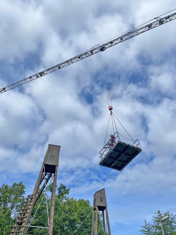 Zunächst werden in den folgenden drei Tagen die Türmen, Stege und Leitern abgeschliffen und mit Holzschutzmittel gestrichen. Dafür ist ein Schwerlastkran mit Personenkorb im Einsatz. In einem weiteren Sanierungsabschnitt werden die unteren Querriegel der fünf Türme ersetzt. Auch davon werden wir berichten…