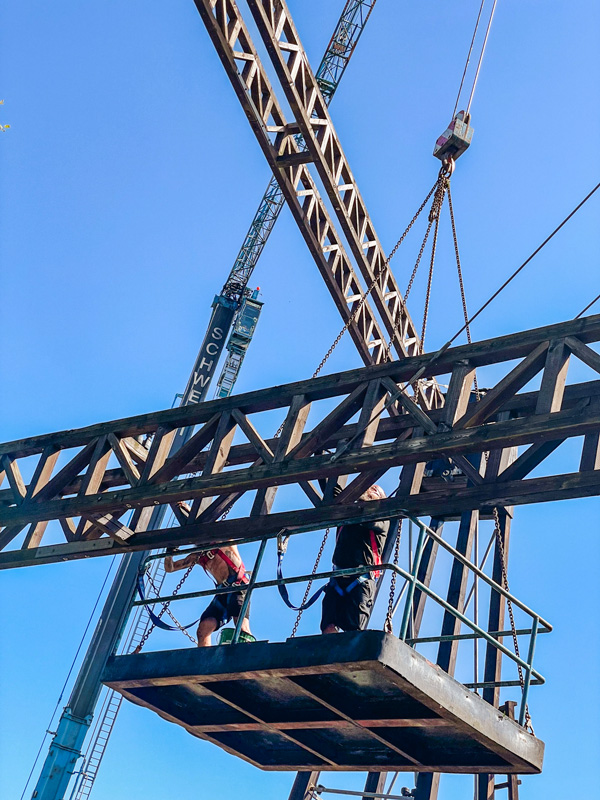 Nach 14 Jahren ist es nötig, die Holzkonstruktion gründlich zu sanieren. Zimmermänner werden Holzbalken austauschen, das Holz abschleifen und mit Holzschutzmittel streichen. Dafür muss für drei Tage ein mobiler Schwerlastkran mit Personenkorb aufgebaut werden, damit die Arbeiten überhaupt ausgeführt werden können.