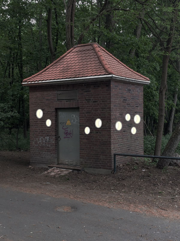 Auch in der Abenddämmerung werden Besucher des Trafohauses die Kunst im Innenraum besichtigen können. Die einzelnen mit Glas geschlossenen Okuli werden auf verschiedenen Höhen in die vier Wände gebohrt, so dass die Besucher unterschiedliche Perspektiven einnehmen können und die Plastiken dreidimensional erfahren werden.