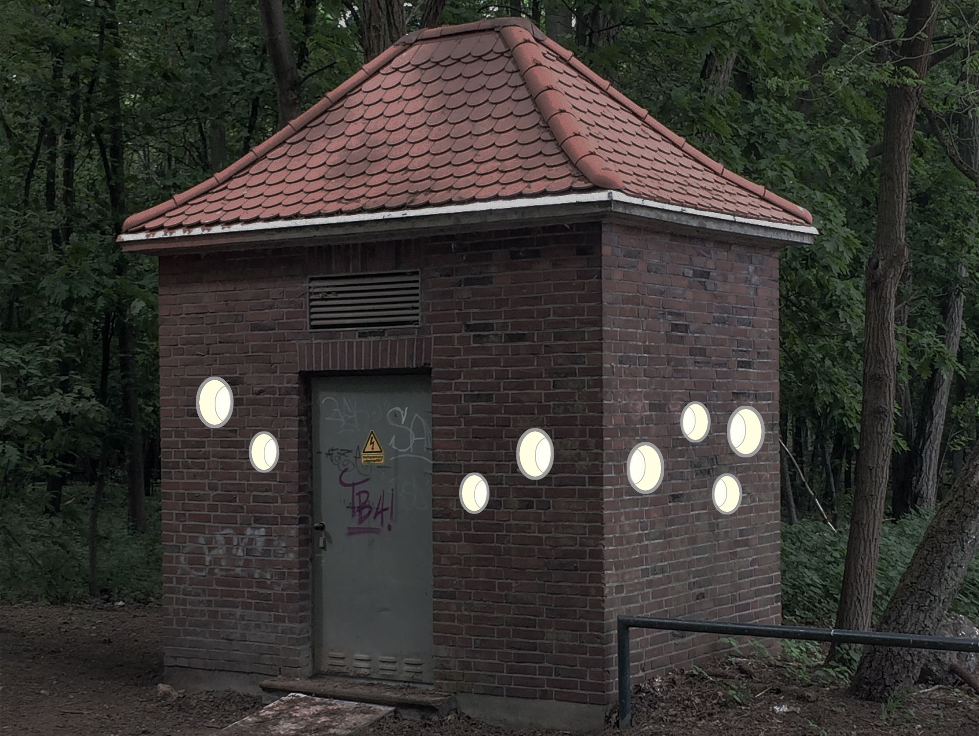 Auch in der Abenddämmerung werden Besucher des Trafohauses die Kunst im Innenraum besichtigen können. Die einzelnen mit Glas geschlossenen Okuli werden auf verschiedenen Höhen in die vier Wände gebohrt, so dass die Besucher unterschiedliche Perspektiven einnehmen können und die Plastiken dreidimensional erfahren werden.