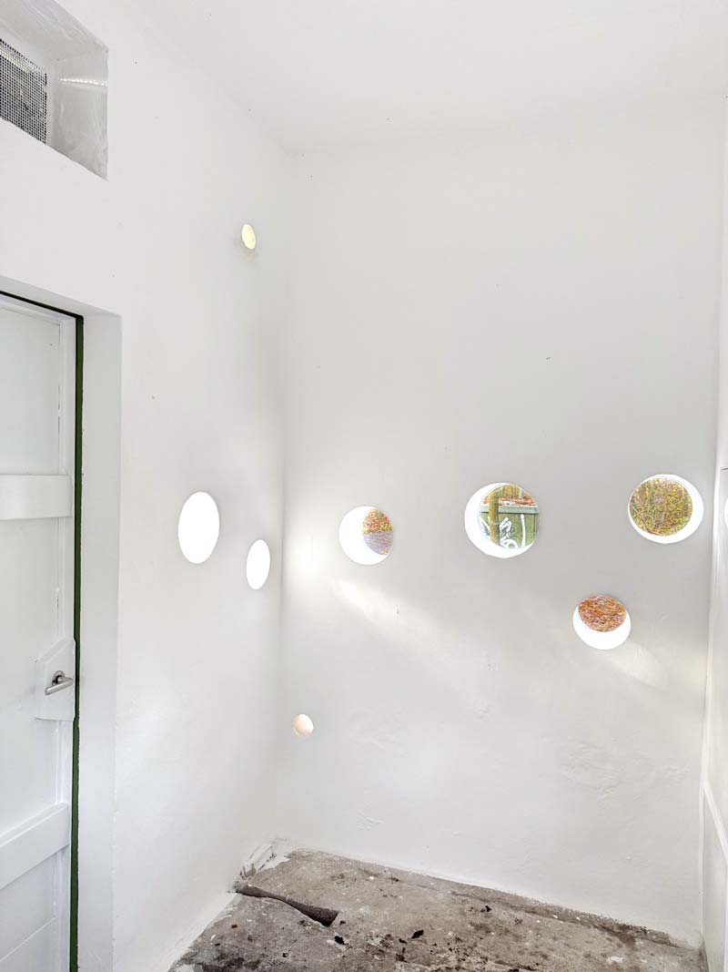 Die 20 kreisrunden Scheiben aus Sicherheitsglas sind eingesetzt. Jetzt ist das Trafohaus dicht und wir können mit dem Finish im Inneren beginnen. Wir bedanken uns für finanzielle und fachmännische Unterstützung durch die Glaserei Kannen.