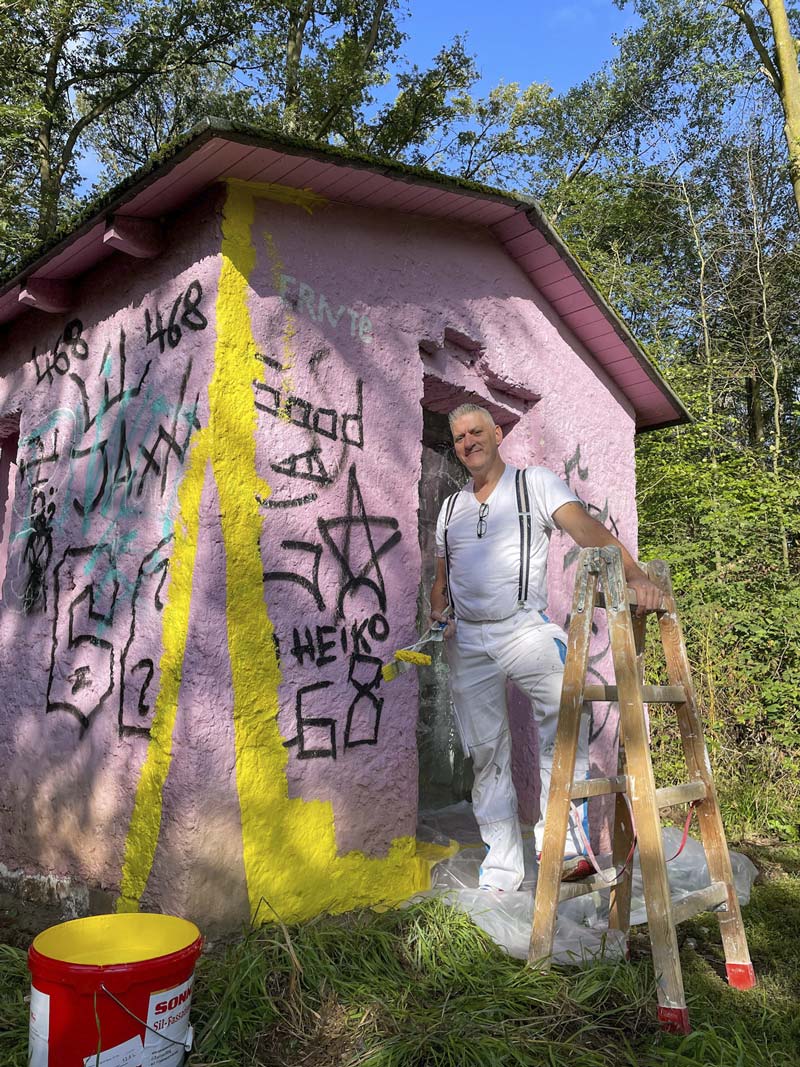 Bernd Mauß von der Malerfirma Fröhling aus Kaarst überstreicht die Graffitis und das Rosa nun mit Gelb.